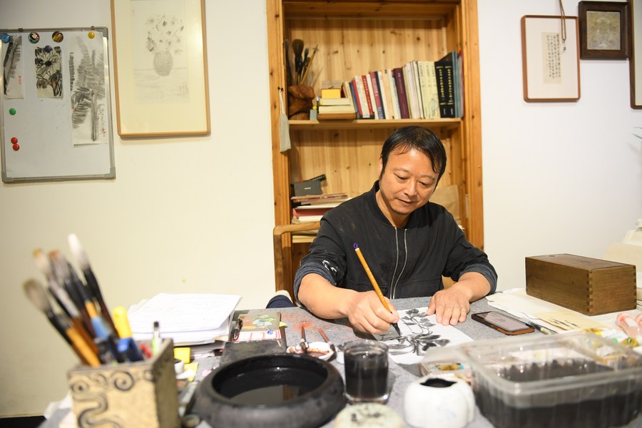 This photo taken on Nov. 9, 2023 shows ink and wash paintings done on modern Kaihua paper at Huang Hongjian's studio in Kaihua County of Quzhou, east China's Zhejiang Province. (Xinhua/Weng Xinyang)