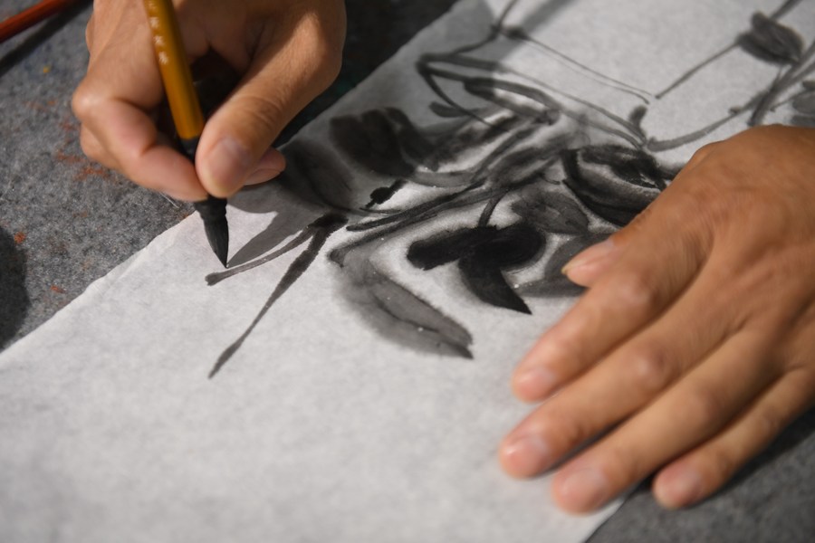 Huang Hongjian paints on a piece of paper he made at his studio in Kaihua County of Quzhou, east China's Zhejiang Province, Nov. 9, 2023. (Xinhua/Weng Xinyang)