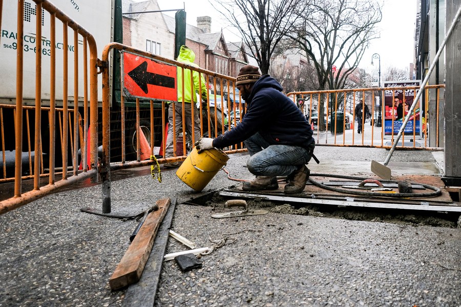A construction worker fixes the sidewalk in New York, the United States, on Jan. 6, 2023. (Photo by Ziyu Julian Zhu/Xinhua)