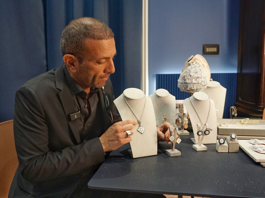 Marco Russo, the CEO of Italian jewelry brand Russo Cammei, introduces cameo items at the Coral Palace near Naples, Italy, Oct. 24, 2023. (Xinhua/He Fei)