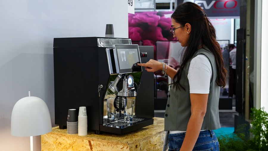 A woman uses an automatic coffee machine produced by Italy's Rhea Vendors Group showcased in Milan, Italy, Oct. 17, 2023. (Xinhua/Zhou Xiaotian)