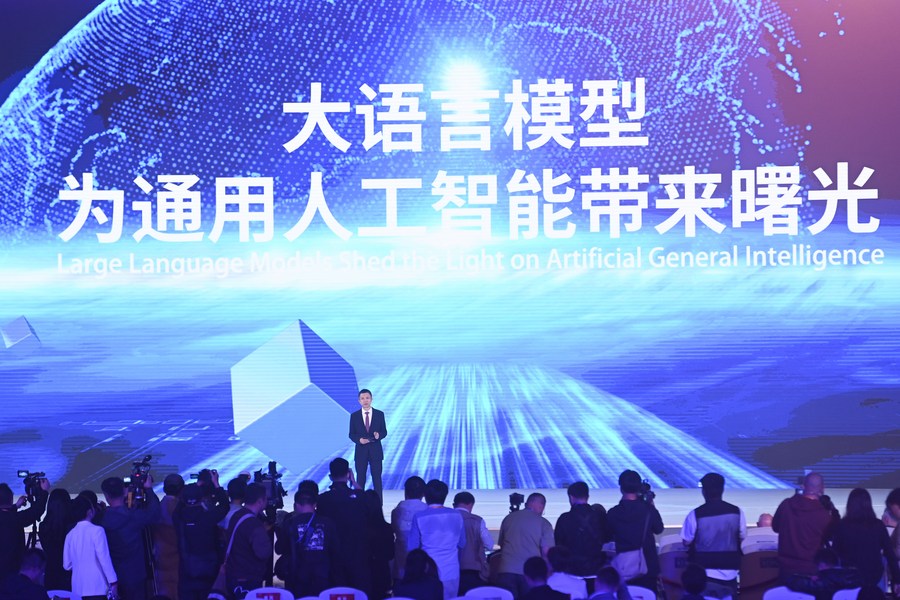 A speaker presents large language models during the 2023 World Internet Conference Wuzhen Summit in the town of Wuzhen in east China's Zhejiang Province, Nov. 8, 2023. (Xinhua/Huang Zongzhi)