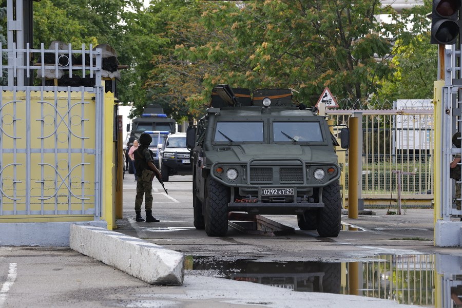 Service members stand guard at a checkpoint near the Zaporizhzhia nuclear power plant in southern Ukraine, Sept. 1, 2022. (Photo by Victor/Xinhua)