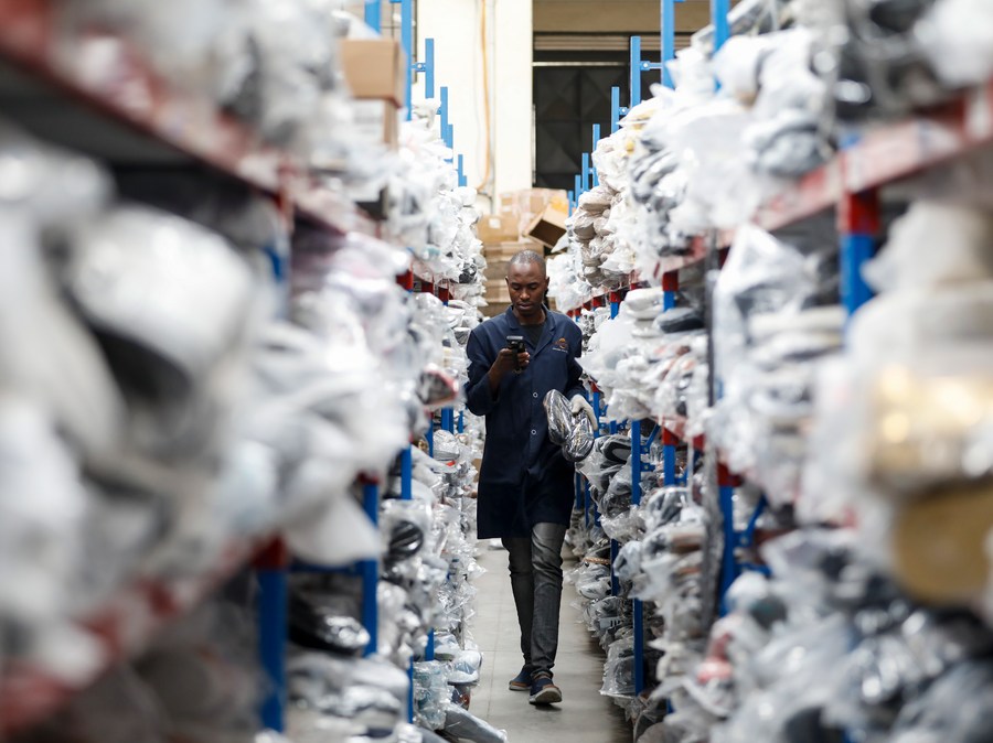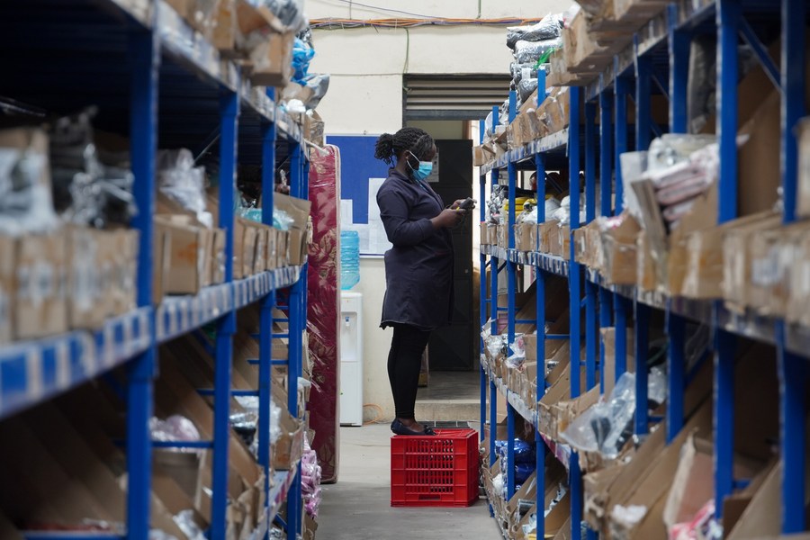 A staff member of Kilimall works at a warehouse in Mlolongo, Kenya, Nov. 10, 2023. (Xinhua/Li Yahui)