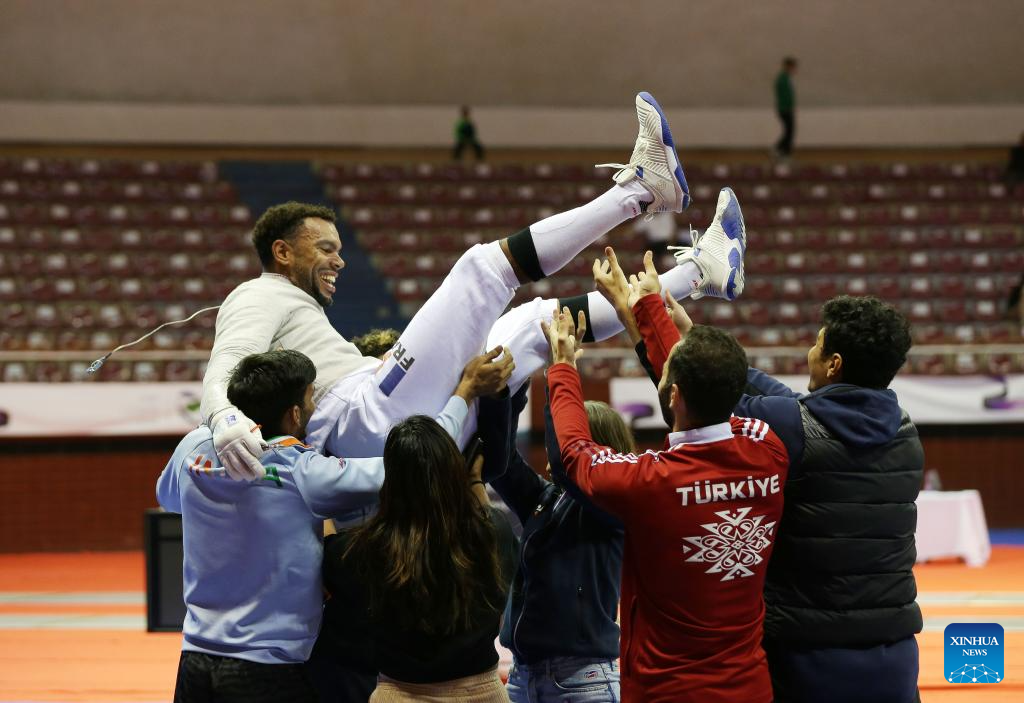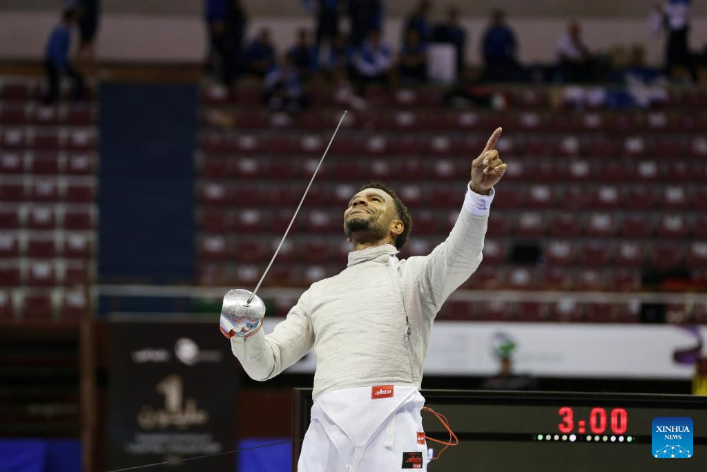 Bolade Apithy of France celebrates after winning the men's sabre individual final at the 2023 Fencing World Cup in Algiers, Algeria, on Nov. 11, 2023. (Xinhua)