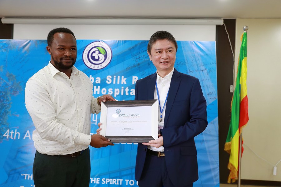 Wang Jianhua (R), chief executive officer (CEO) of Addis Ababa Silk Road General Hospital, receives a certificate from Anteneh Kassaye (L), CEO of Arba Minch General Hospital, in Addis Ababa, Ethiopia, on Nov. 4, 2023. (Xinhua/Wang Ping)