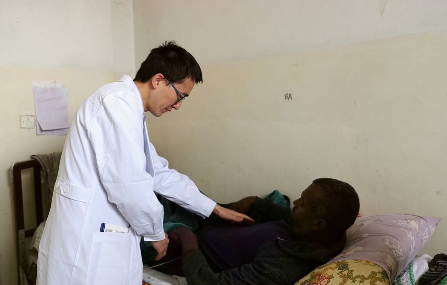 Wang Xiaojun (L), leader of the ninth Chinese medical expert team, checks conditions of a patient in Addis Ababa, capital of Ethiopia, June 23, 2023. (Xinhua/Wang Ping)