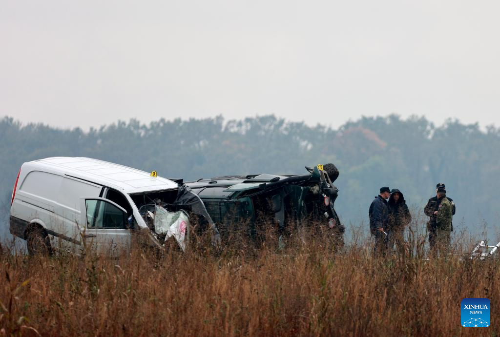 Police officers inspect the car accident site at DC-55 state road in Vinkovci, Croatia on Nov. 11, 2023. Croatian Prime Minister Andrej Plenkovic announced on Saturday to dismiss Defense Minister Mario Banozic who was involved in a serious car accident at Vinkovci and left him seriously injured and the other driver in the car accident killed. (Davor Javorovic/PIXSELL via Xinhua)