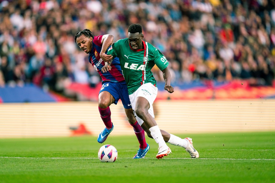 Jules Kounde (L) of Barcelona vies with Samu Omorodion of Alaves during the match. (Photo by Joan Gosa/Xinhua)