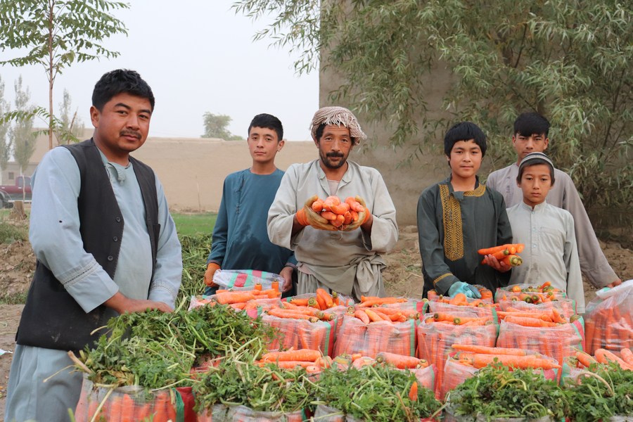 Farmers display newly-harvested carrots in Balkh province, Afghanistan, Nov. 11, 2023. (Photo by M Fardin Nawrozi/Xinhua)