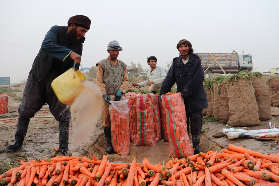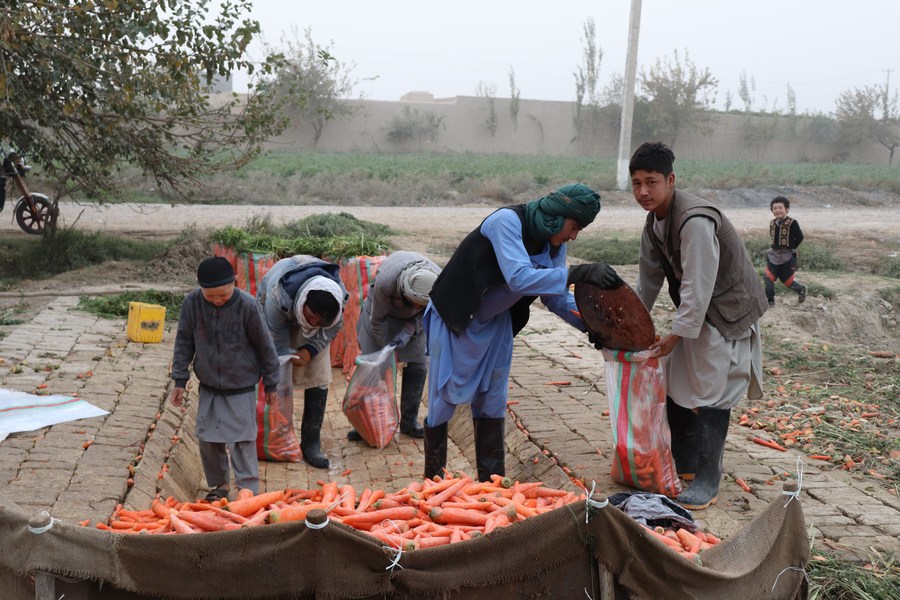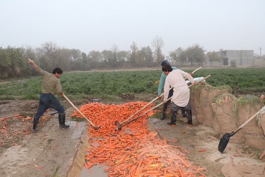 Farmers pack newly-harvested carrots in Balkh province, Afghanistan, Nov. 11, 2023. (Photo by M Fardin Nawrozi/Xinhua)