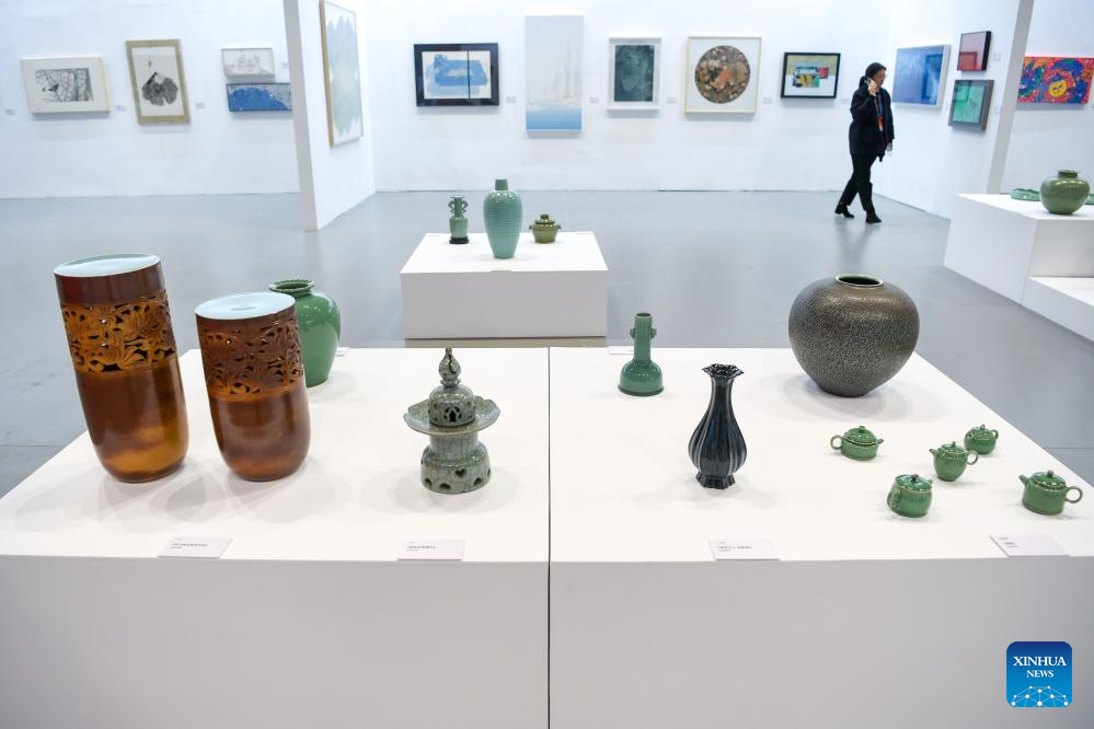 A guest visits an exhibition of the 2023 annual conference of the Cross-Strait CEO Summit in Nanjing, east China's Jiangsu Province, Nov. 14, 2023. The 2023 annual conference of the Cross-Strait CEO Summit, which celebrates its 10th anniversary this year, opened Tuesday in Nanjing, east China's Jiangsu Province. (Xinhua/Li Bo)