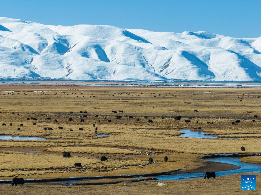 This photo taken on Nov. 5, 2023 shows yaks at a pasture in Damxung County, southwest China's Xizang Autonomous Region.