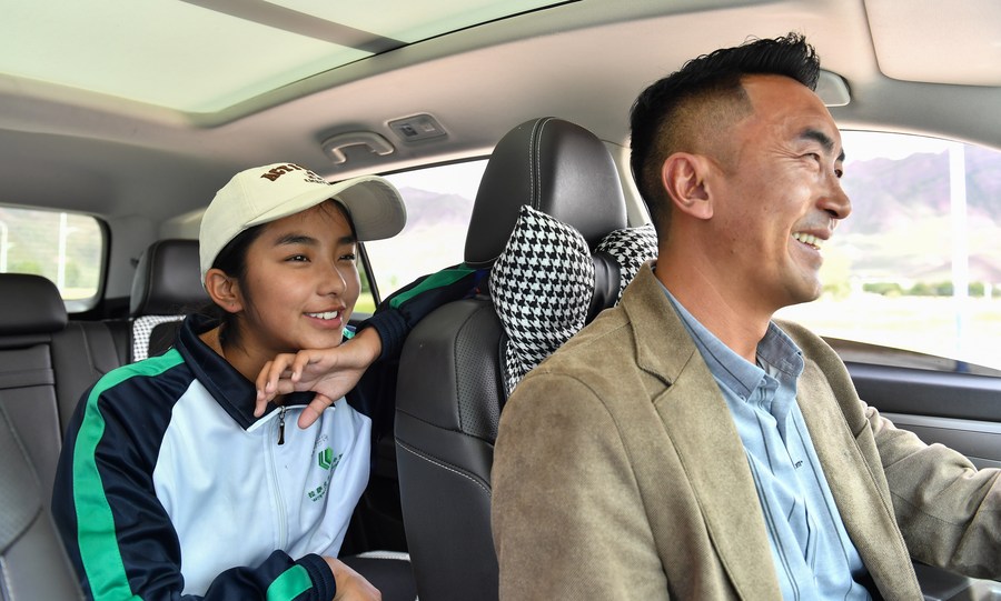 Jamba Yonten (R) picks his daughter up after school in Lhasa, capital of southwest China's Xizang Autonomous Region, Sept. 10, 2023. (Xinhua/Jigme Dorje)