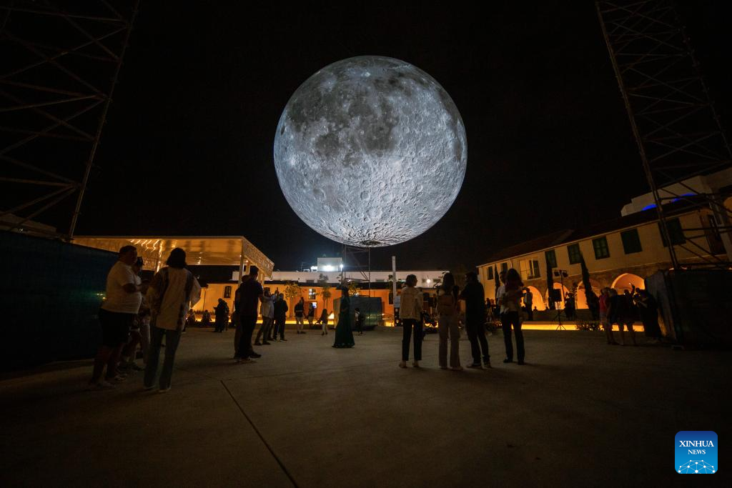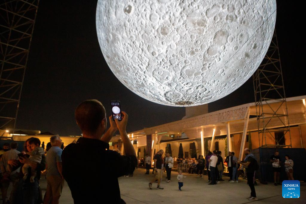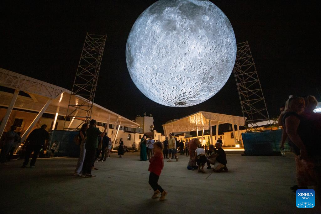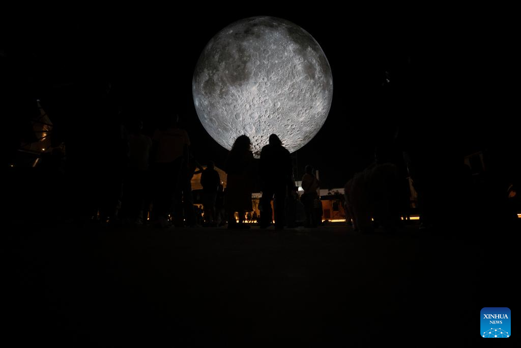 People visit the installation of the "Museum of the Moon" in Larnaca, Cyprus, on Nov. 13, 2023. Created by renowned British artist Luke Jerram, the "Museum of the Moon", a 7-meter wide model of the moon, was displayed here from Monday to Sunday. (Photo by George Christophorou/Xinhua)