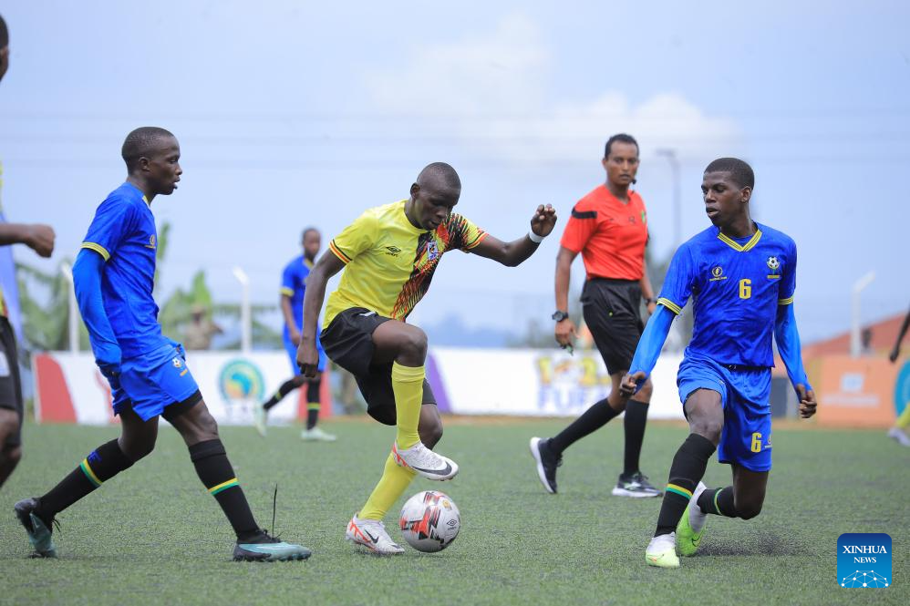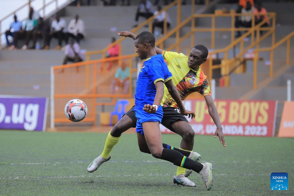 Okello Richard (2nd L) of Uganda controls the ball during the semifinal match between Uganda and Tanzania at the Council for East and Central Africa Football Associations (CECAFA) U15 Boys Championship at FUFA Technical Centre at Njeru in Buikwe District, Uganda, on Nov. 13, 2023. (Photo by Hajarah Nalwadda/Xinhua)