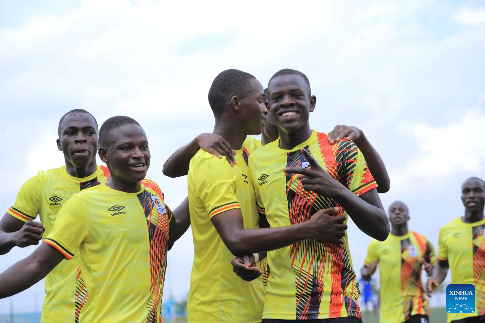 Players of Uganda celebrate a goal during the semifinal match between Uganda and Tanzania at the Council for East and Central Africa Football Associations (CECAFA) U15 Boys Championship at FUFA Technical Centre at Njeru in Buikwe District, Uganda, on Nov. 13, 2023. (Photo by Hajarah Nalwadda/Xinhua)