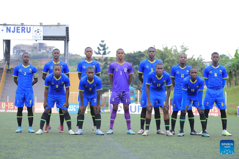 Players of Tanzania pose for a picture before the start of the semifinal match between Uganda and Tanzania at the Council for East and Central Africa Football Associations (CECAFA) U15 Boys Championship at FUFA Technical Centre at Njeru in Buikwe District, Uganda, on Nov. 13, 2023. (Photo by Hajarah Nalwadda/Xinhua)