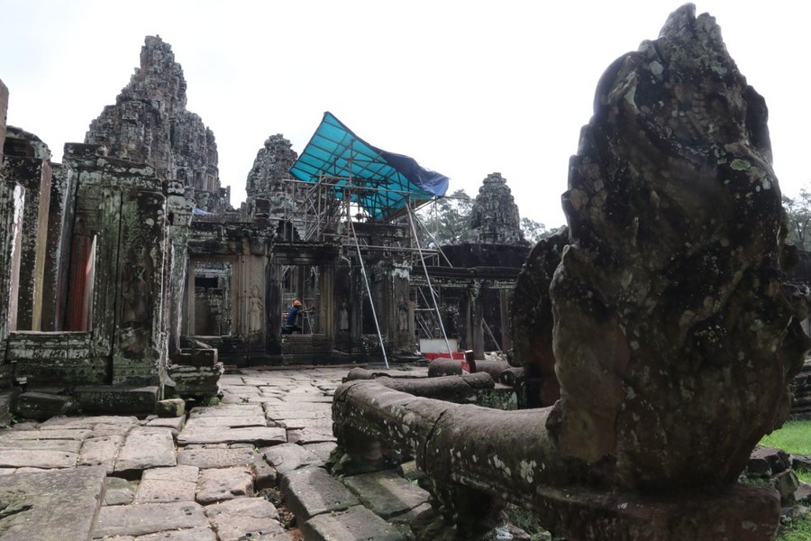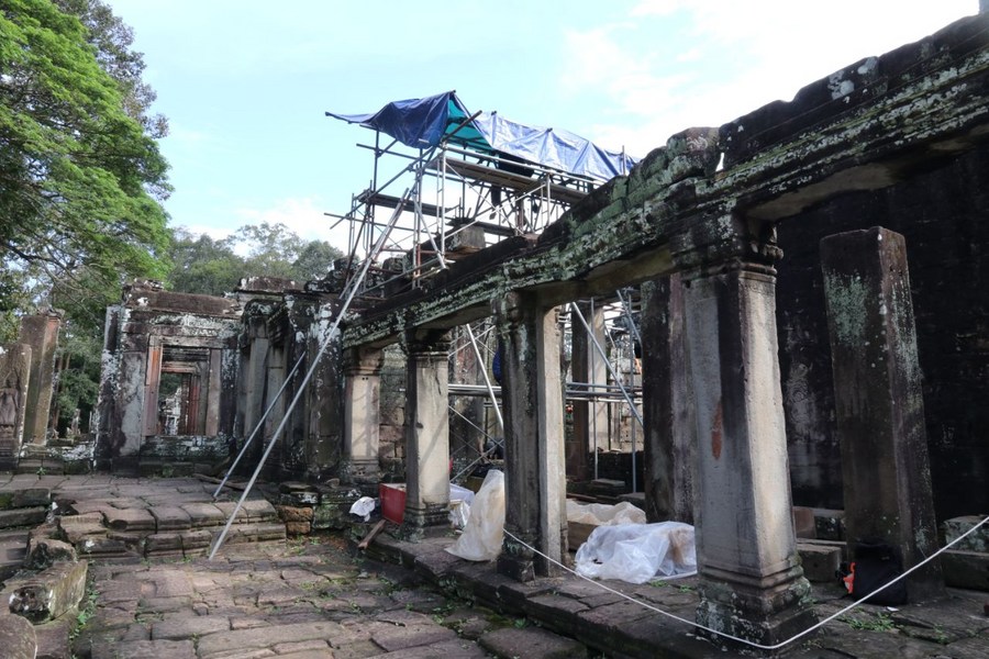 PHNOM PENH, Nov. 14 (Xinhua) -- Restoration work has been underway at the west door frame of the Bayon temple in Cambodia's famed Angkor Archaeological Park, the Apsara National Authority (ANA) said in a news release on Monday.