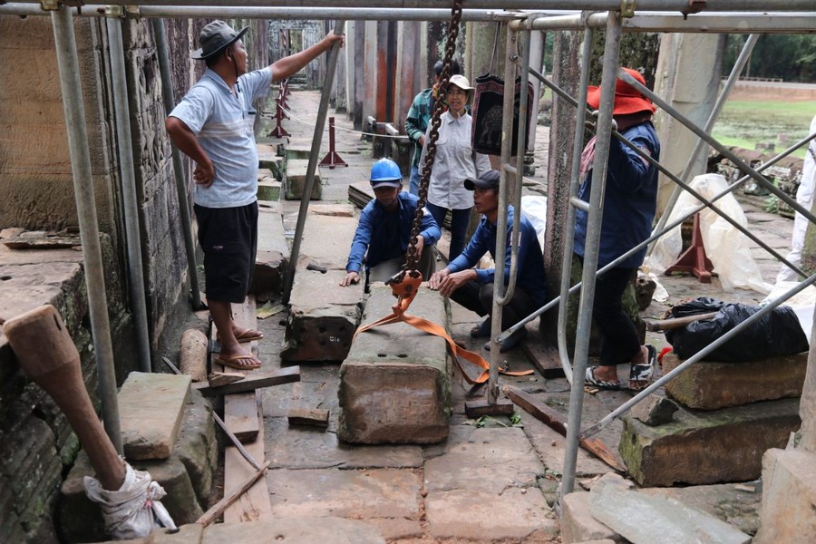 This undated photo shows staff members working at the restoration site of the west door frame of the Bayon temple in Angkor Archaeological Park in Siem Reap province, Cambodia. (Apsara National Authority/Handout via Xinhua)