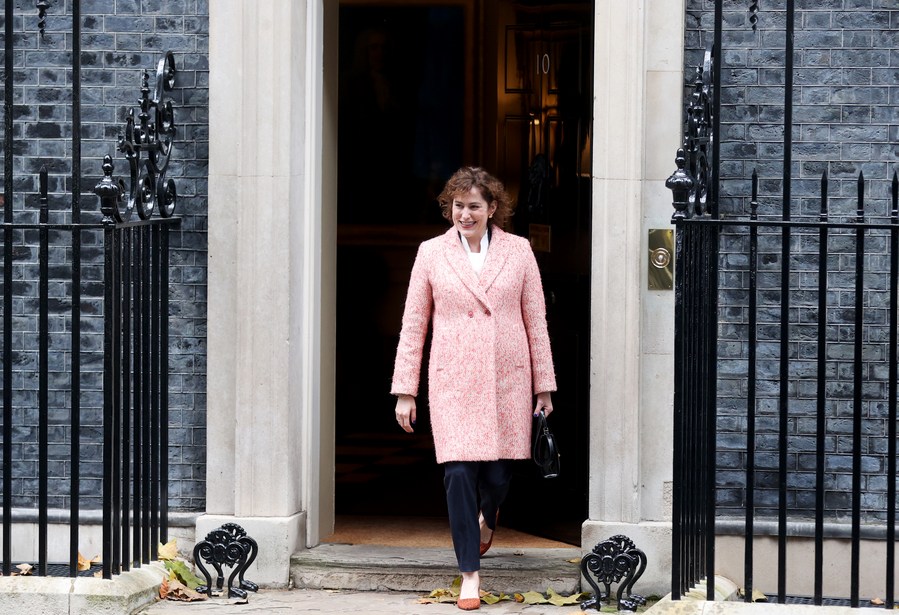 Britain's newly appointed Chief Secretary to the Treasury Laura Trott leaves 10 Downing Street in London, Britain, Nov. 13, 2023. (Xinhua/Li Ying)