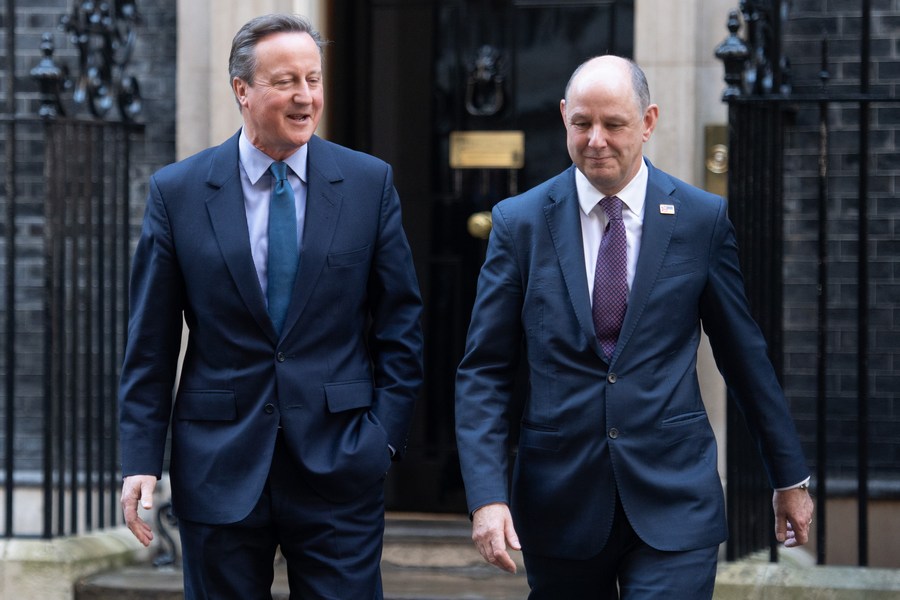 Britain's newly appointed Foreign Secretary David Cameron (L) walks outside 10 Downing Street in London, Britain, Nov. 13, 2023. (Xinhua)