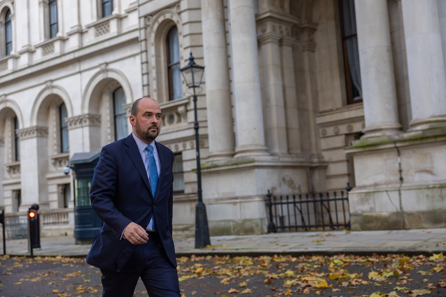 Britain's newly appointed Conservative Party Chairman Richard Holden arrives at 10 Downing Street in London, Britain, Nov. 13, 2023. (Simon Walker/No 10 Downing Street/Handout via Xinhua)