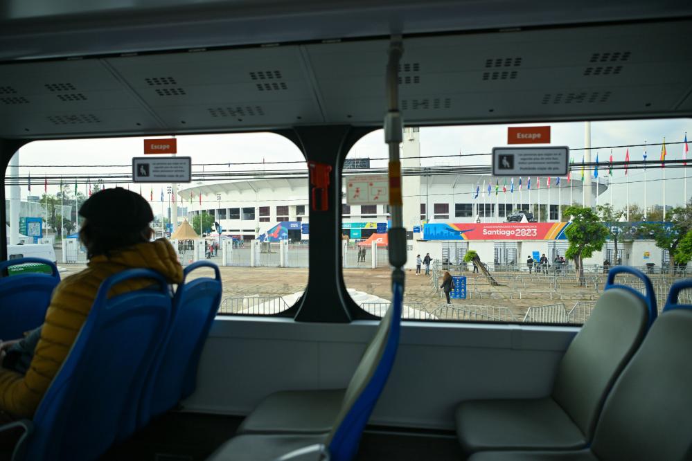 An electric bus for the Pan American Games 2023 runs past the National Stadium in Santiago, Chile, Nov. 2, 2023. (Xinhua/Xin Yuewei)