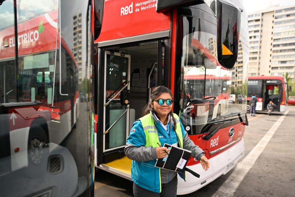 A staff member patrols inside an electric bus for the Pan American Games 2023 in Santiago, Chile, Nov. 2, 2023. (Xinhua/Xin Yuewei)