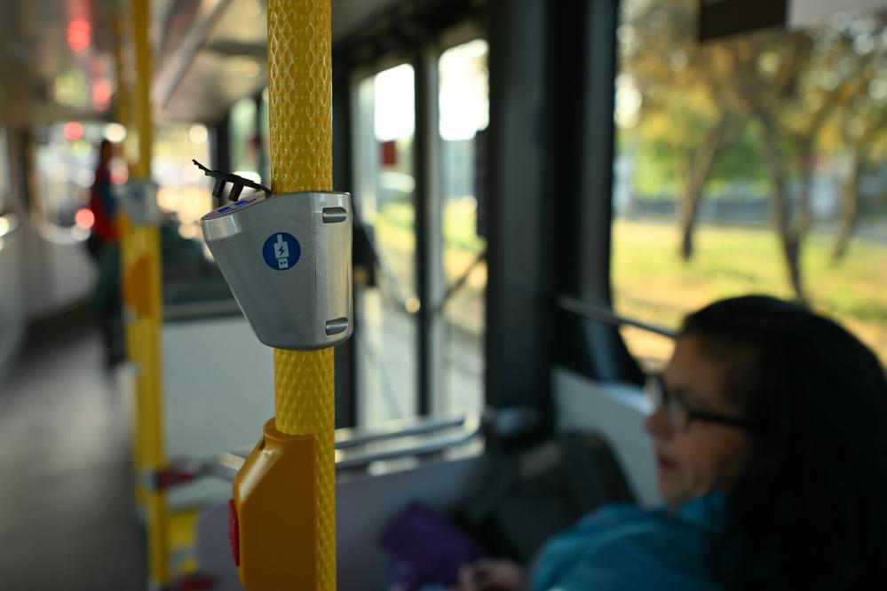 This photo taken on Nov. 2, 2023 shows a USB charging station inside an electric bus for the Pan American Games 2023 in Santiago, Chile. (Xinhua/Xin Yuewei)