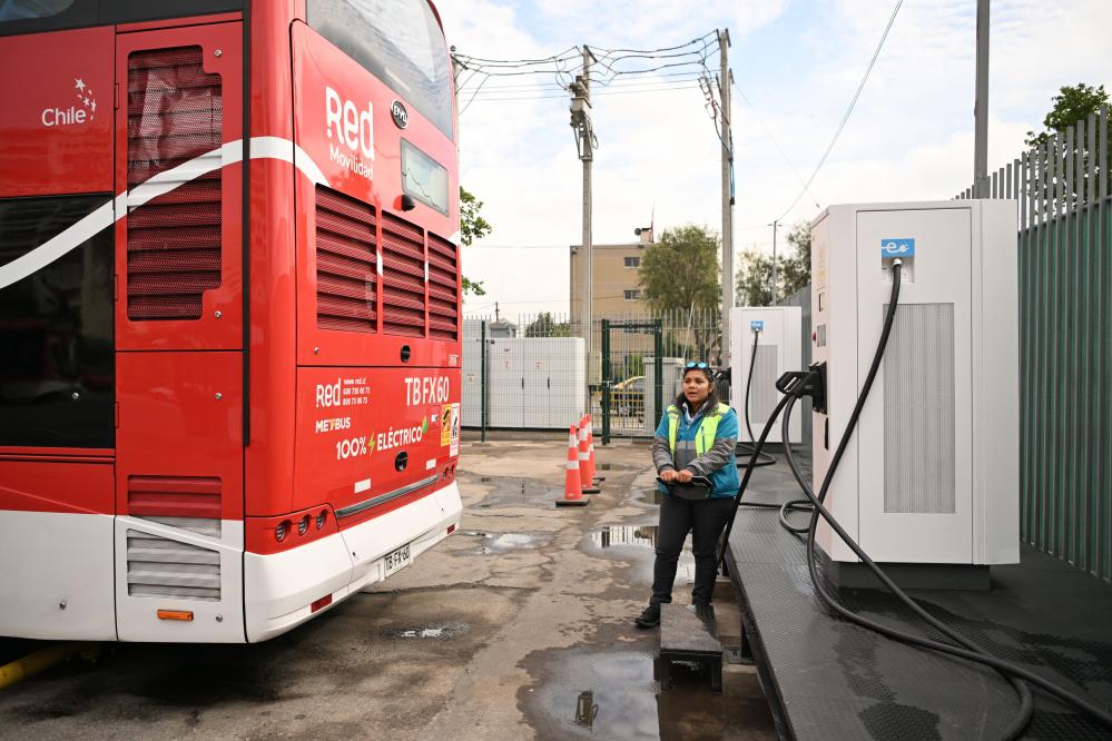 A driver stands beside a charging station for electric buses in Santiago, Chile, Nov. 2, 2023. (Xinhua/Xin Yuewei)