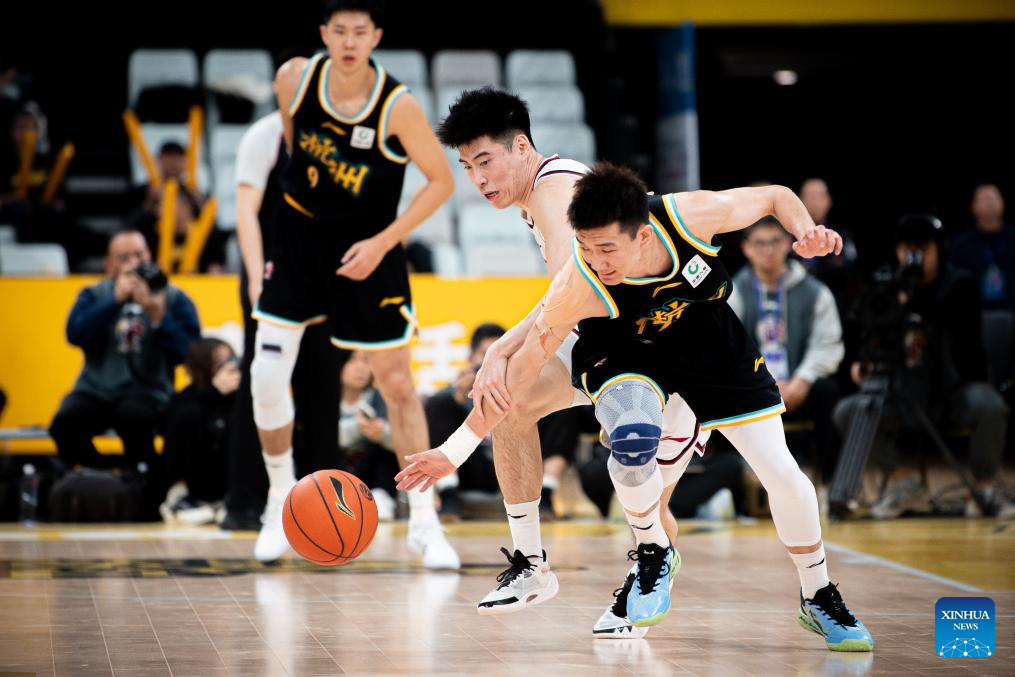 Sun Minghui (R) of Zhejiang Lions competes against Cheng Shuaipeng of Zhejiang Golden Bulls during the 10th round match between Zhejiang Lions and Zhejiang Golden Bulls at 2023-2024 season of the Chinese Basketball Association (CBA) league in Hangzhou, east China's Zhejiang Province, Nov. 14, 2023. (Xinhua/Jiang Han)