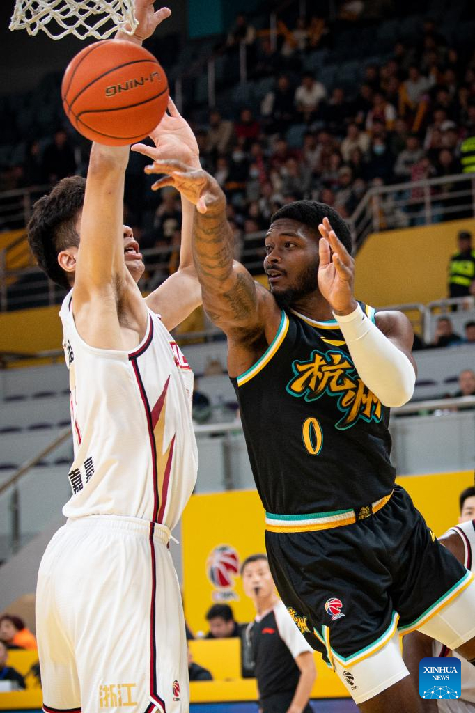 Cameron Oliver (R) of Zhejiang Lions passes the ball during the 10th round match between Zhejiang Lions and Zhejiang Golden Bulls at 2023-2024 season of the Chinese Basketball Association (CBA) league in Hangzhou, east China's Zhejiang Province, Nov. 14, 2023. (Xinhua/Jiang Han)