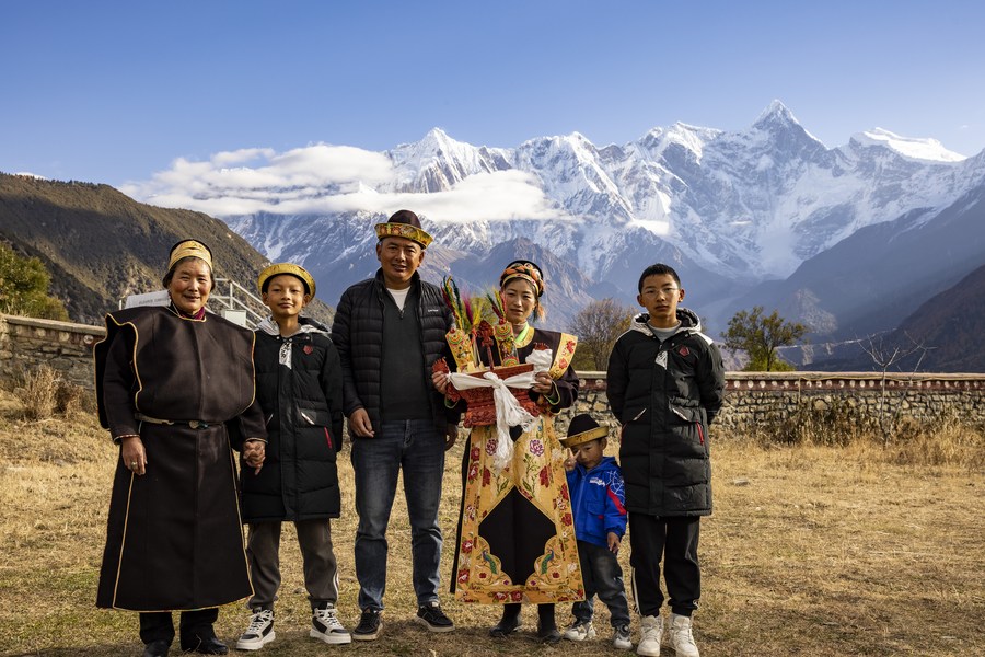 Tsering Toinzhub (3rd L) and Lhapa Drolma (4th L) pose for a photo with their family in Suosong Village of Nyingchi, southwest China's Xizang Autonomous Region, Nov. 14, 2023.(Xinhua/Jiang Fan)