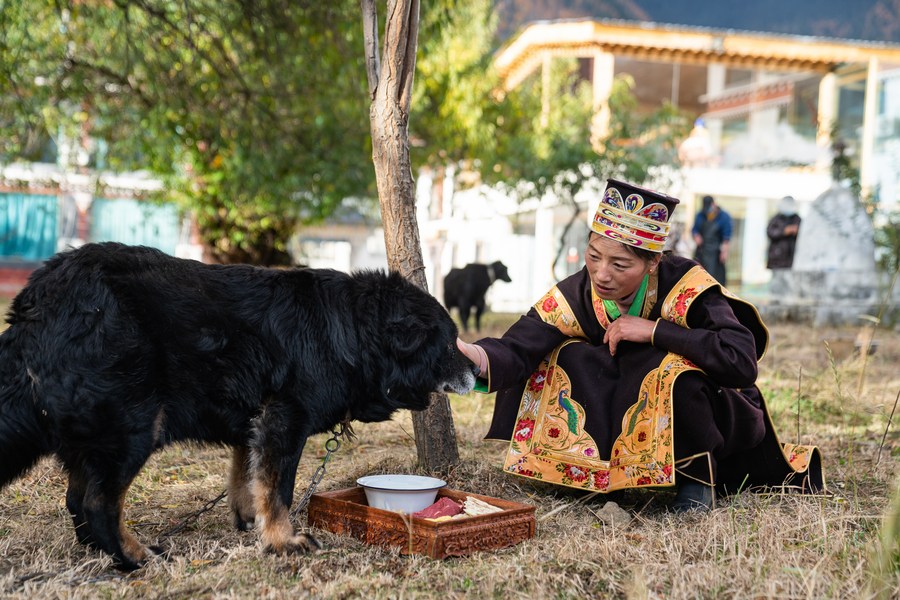 Lhapa Drolma feeds a dog in Suosong Village of Nyingchi, southwest China's Xizang Autonomous Region, Nov. 14, 2023.(Xinhua/Tenzin Nyida)