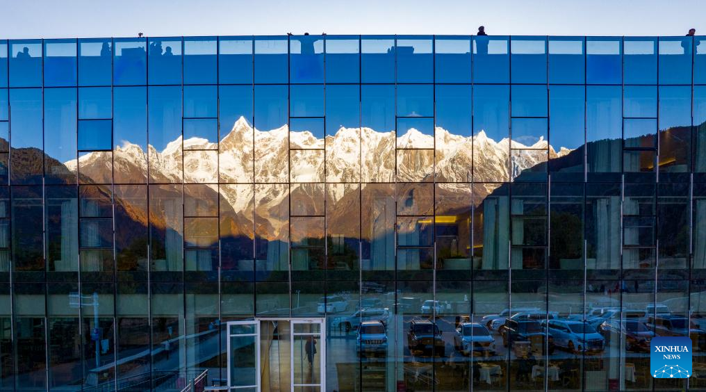 This aerial photo taken on Nov. 13, 2023 shows the reflection of a sunset scenery of Mount Namcha Barwa on a glass wall of a hotel in Suosong Village of Nyingchi, southwest China's Tibet Autonomous Region. (Xinhua/Jiang Fan)