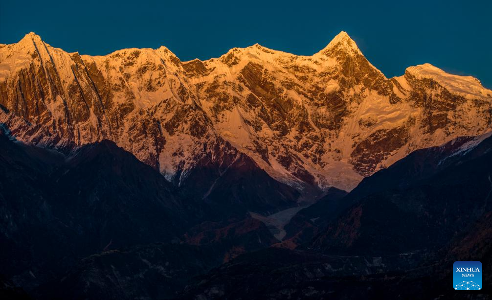 This photo taken on Nov. 13, 2023 shows the sunset scenery of Mount Namcha Barwa seen at Suosong Village of Nyingchi, southwest China's Tibet Autonomous Region. (Xinhua/Jiang Fan)
