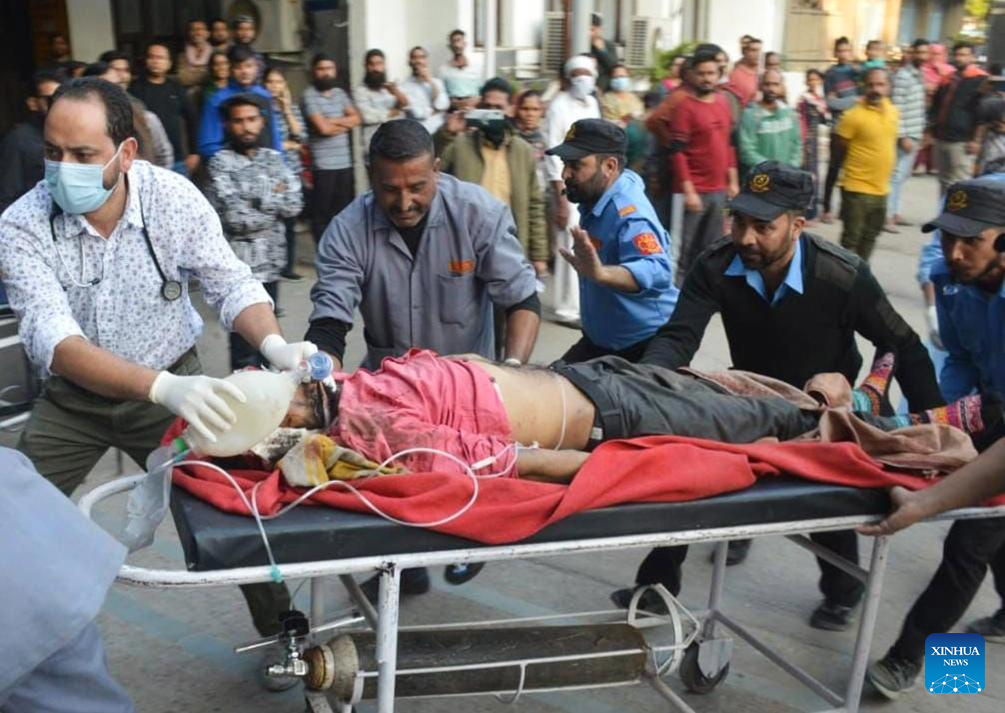 An injured person is transferred at a government medical college in Jammu city of Indian-controlled Kashmir Nov. 15, 2023. Thirty-six people were killed and 19 others injured, some of them critically, on Wednesday after a passenger bus skidded off a mountainous road and fell into a deep gorge in Kashmir, officials said. (UNI Photo/Handout via Xinhua)