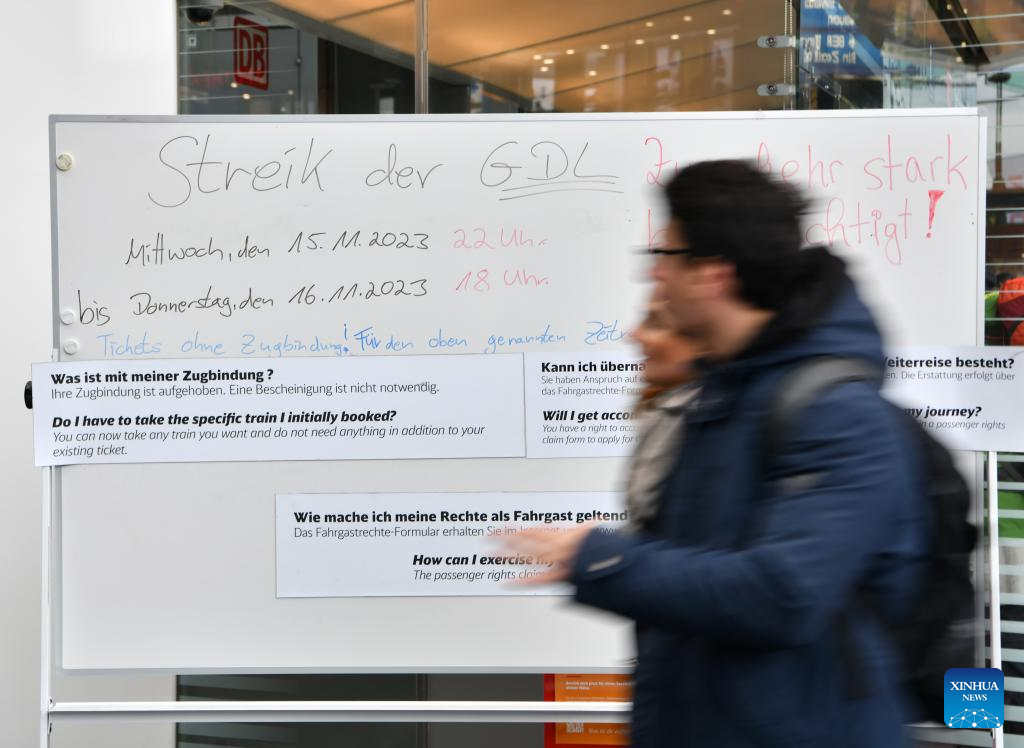 BERLIN, Nov. 15 (Xinhua) -- Germany is bracing for a short-notice nationwide rail strike that is scheduled to start on Wednesday evening local time and last 20 hours.