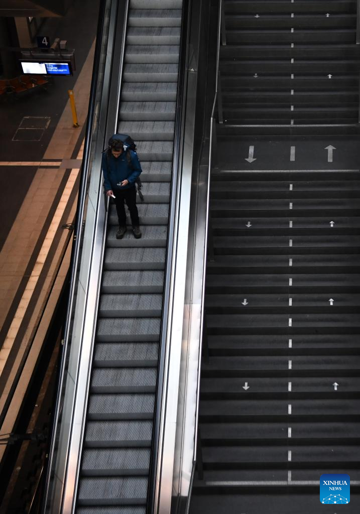 A passenger takes an escalator at Berlin Central Train Station in Berlin, Germany, Nov. 16, 2023. Germany is bracing for a short-notice nationwide rail strike that is scheduled to start on Wednesday evening local time and last 20 hours. (Xinhua/Ren Pengfei)