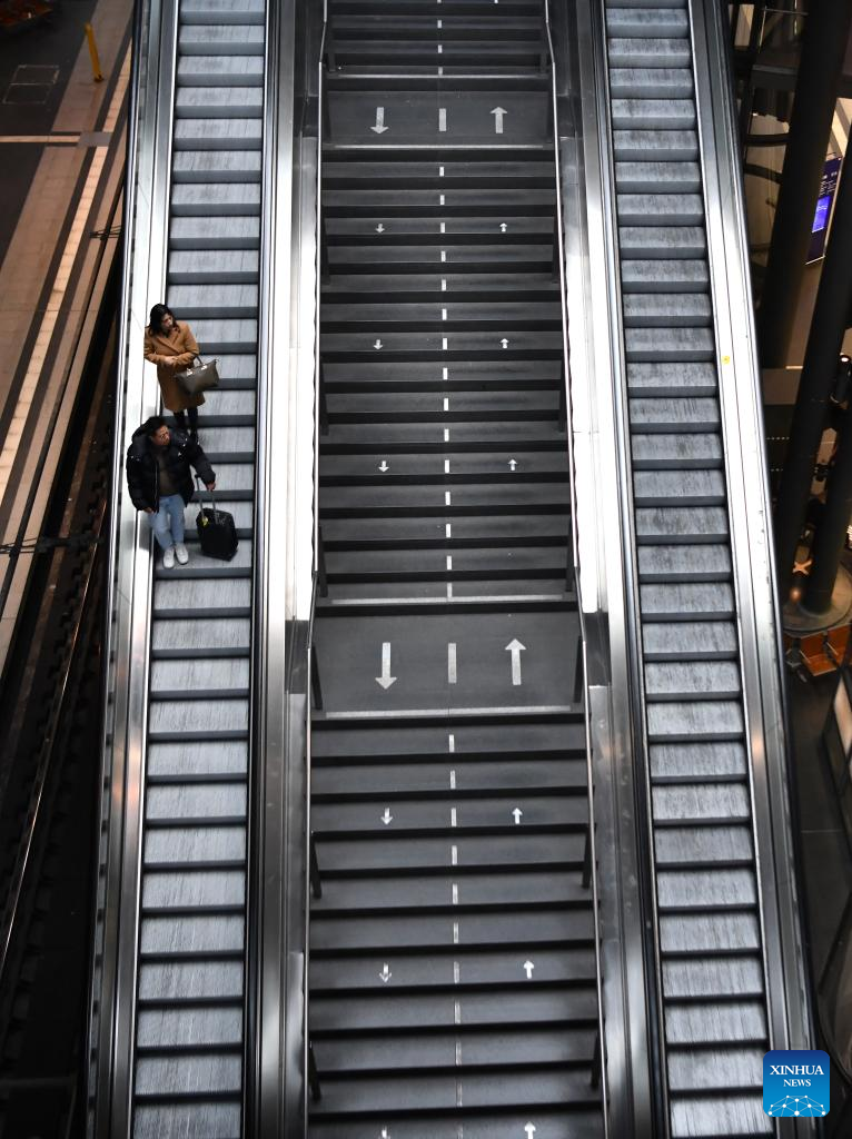Passengers take an escalator at Berlin Central Train Station in Berlin, Germany, Nov. 16, 2023. Germany is bracing for a short-notice nationwide rail strike that is scheduled to start on Wednesday evening local time and last 20 hours. (Xinhua/Ren Pengfei)