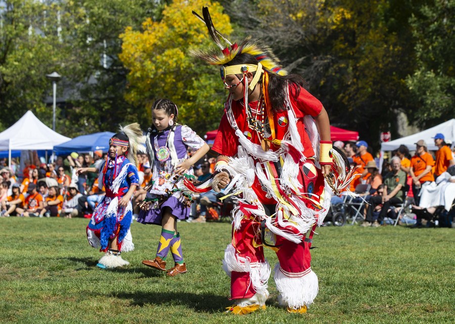People dressed in indigenous costumes dance at a commemoration event during the third National Day for Truth and Reconciliation in Toronto, Canada, Sept. 30, 2023. (Photo by Zou Zheng/Xinhua)