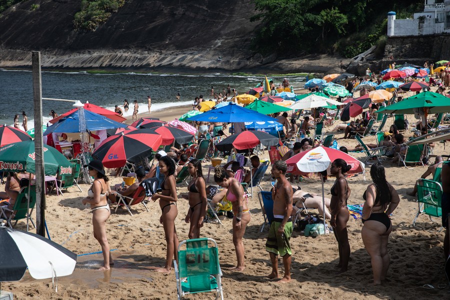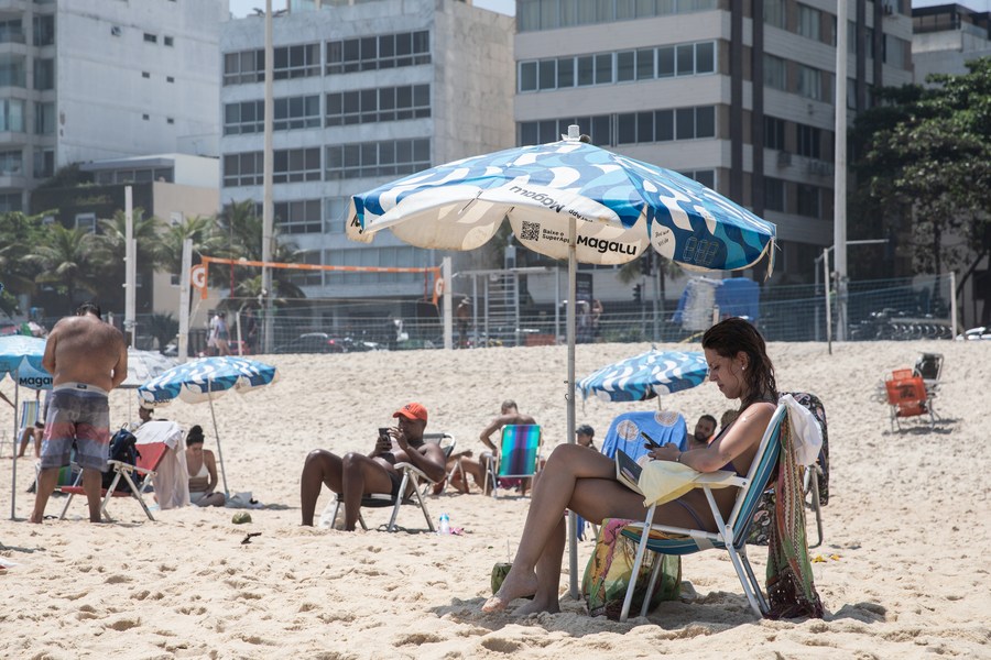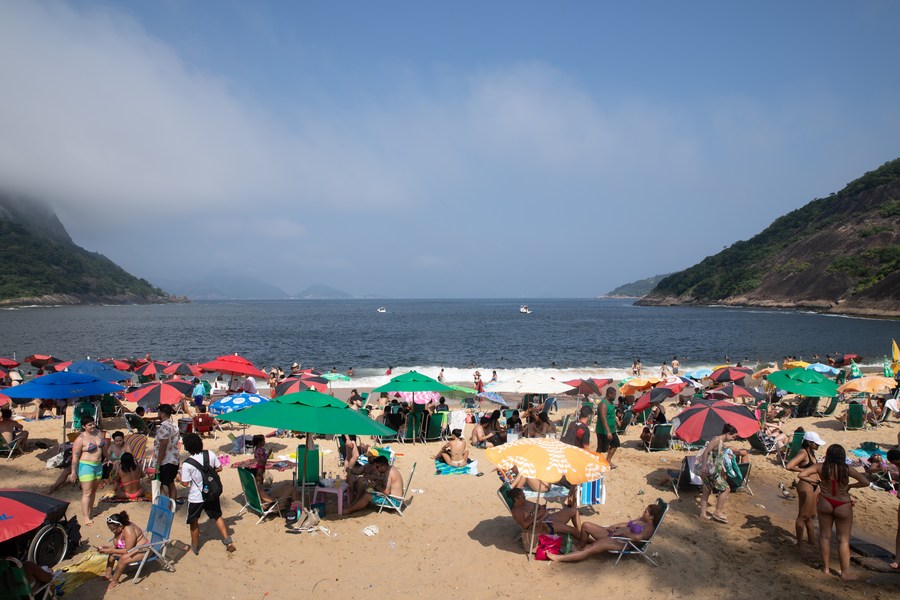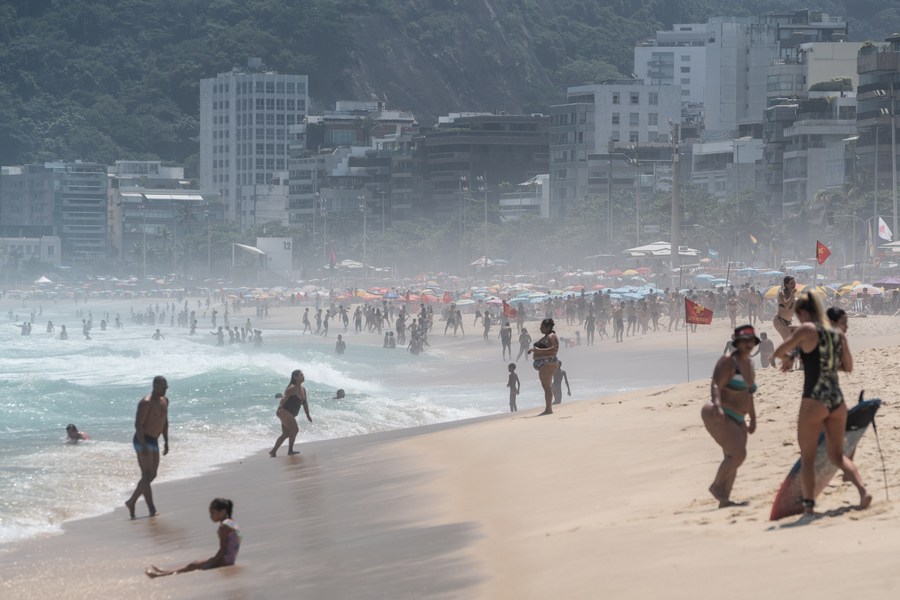 People cool off on a beach in Rio de Janeiro, Brazil, Nov. 14, 2023. (Xinhua/Wang Tiancong)