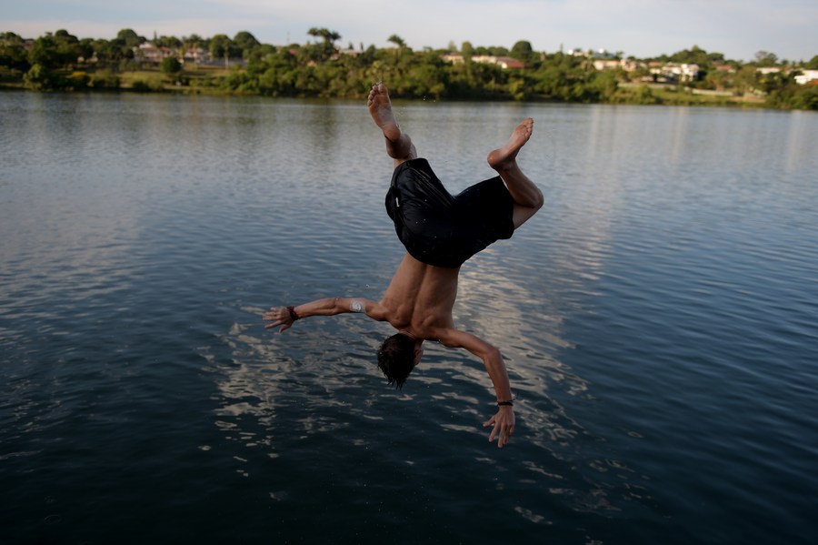 A man jumps into a lake to cool off in Brasilia, Brazil, Nov. 14, 2023. (Photo by Lucio Tavora/Xinhua)