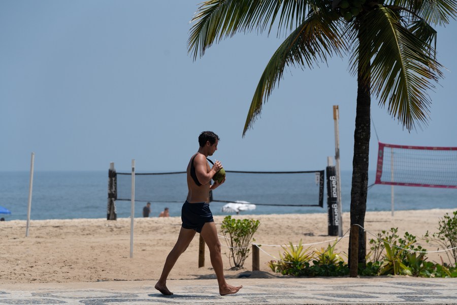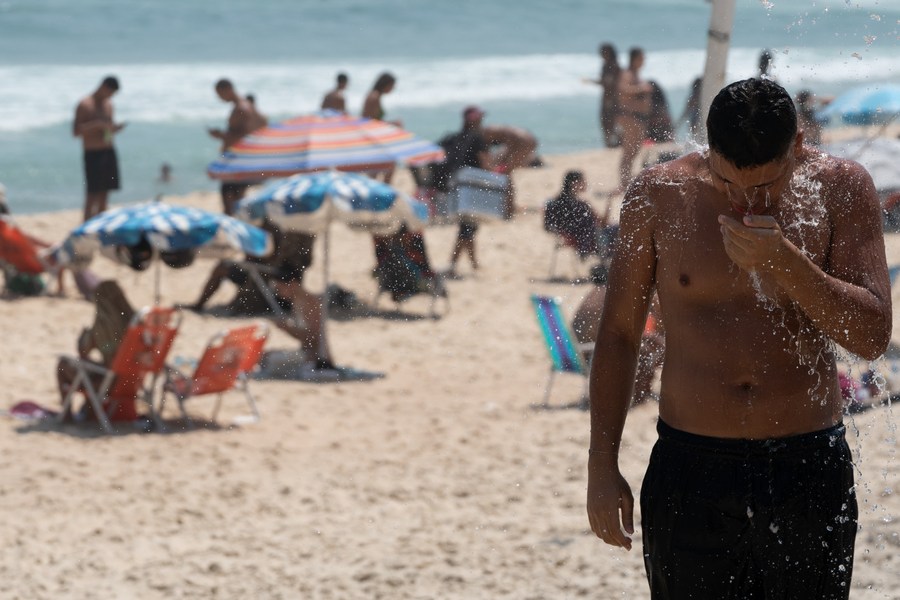 A man takes a shower on the Ipanema beach in Rio de Janeiro, Brazil, Nov. 14, 2023. (Xinhua/Wang Tiancong)