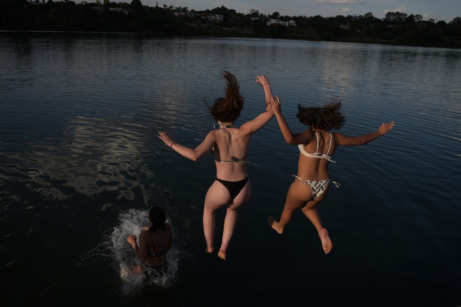 People jump into a lake to cool off in Brasilia, Brazil, Nov. 14, 2023. (Photo by Lucio Tavora/Xinhua)■