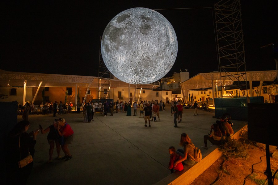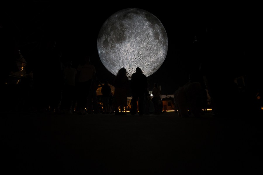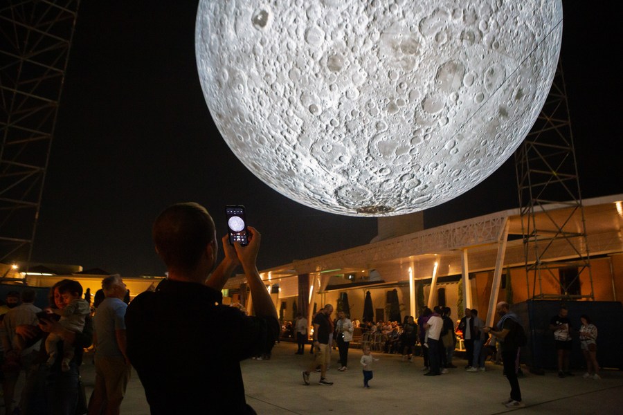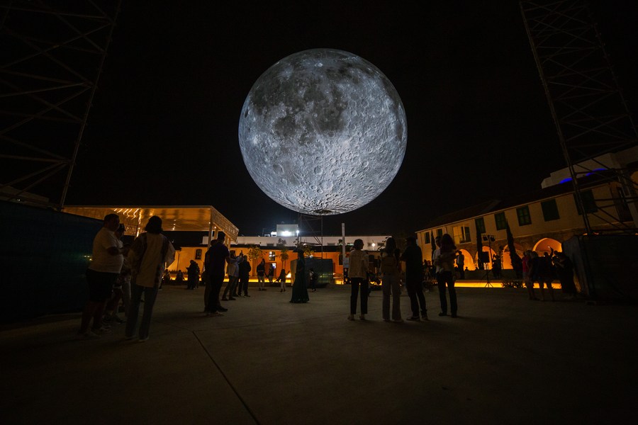 People visit the installation of the "Museum of the Moon" in Larnaca, Cyprus, on Nov. 13, 2023. (Photo by George Christophorou/Xinhua)