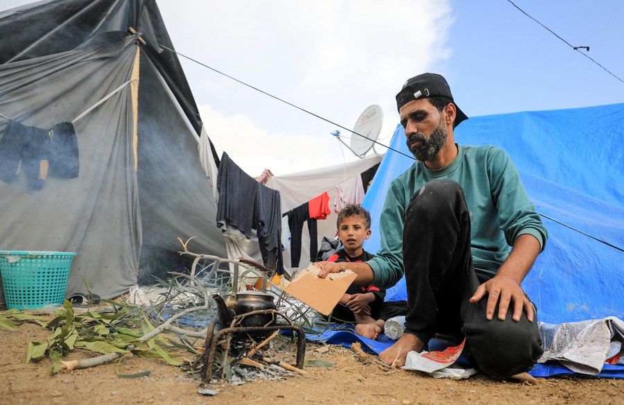 Displaced people are seen at a temporary shelter in the southern Gaza Strip city of Khan Younis, Nov. 14, 2023. (Photo by Yasser Qudih/Xinhua)