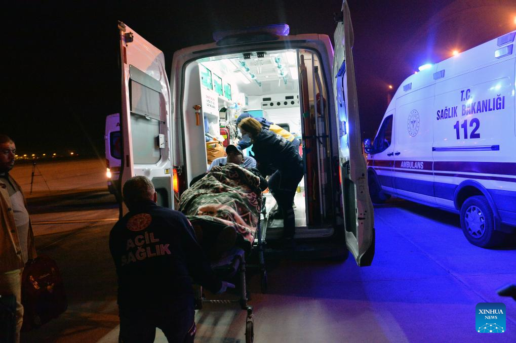 A patient from Gaza is transferred to an ambulance at Esenboga Airport in Ankara, Türkiye on Nov. 16, 2023. Twenty-seven patients from Gaza and their 13 attendants, who passed through the Rafah border crossing from the Gaza Strip to Egypt, arrived in Türkiye's capital here on early Thursday. (Mustafa Kaya/Handout via Xinhua)