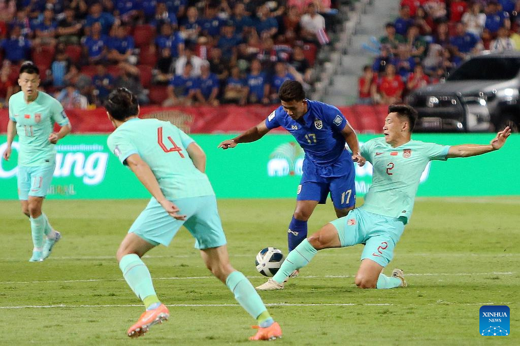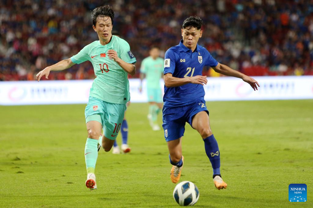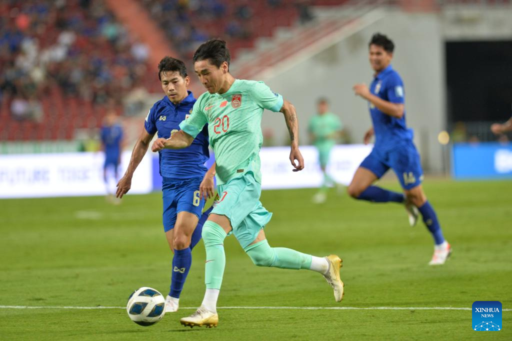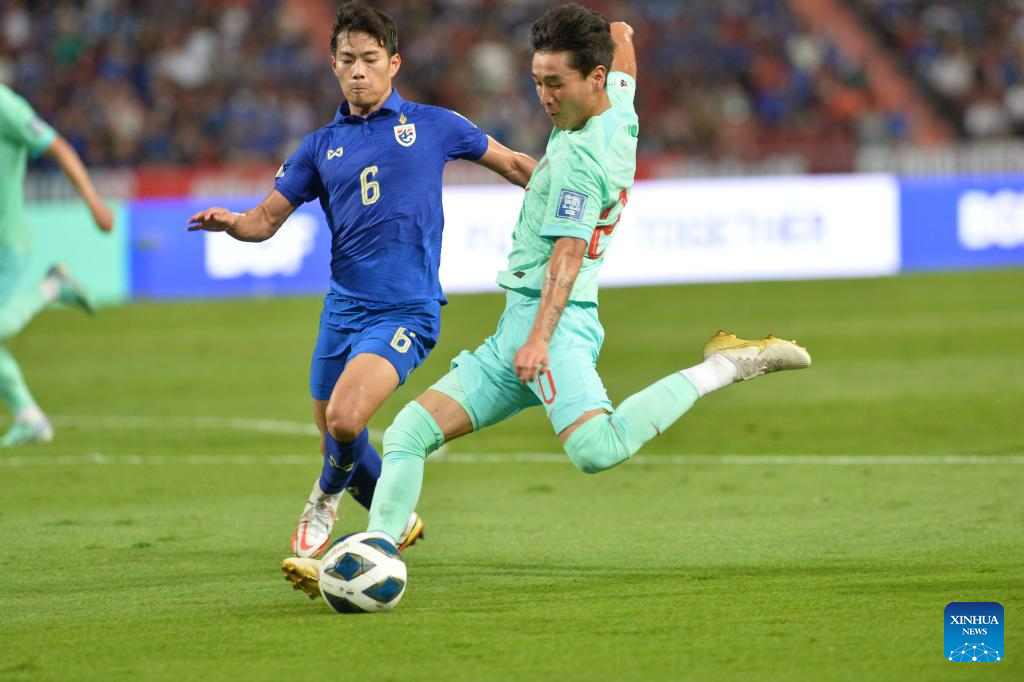 Wu Xi (L) of China breaks through during the Group C match between China and Thailand at the 2026 FIFA World Cup qualifier in Bangkok, Thailand, Nov. 16, 2023. (Xinhua/Wang Teng)